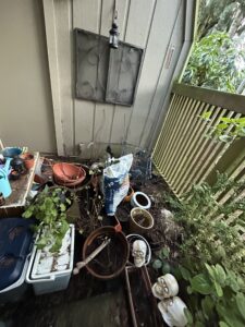Does your patio area look like a swamp? Does it get any sunlight? Are there bags of soil and empty pots cluttering your space?